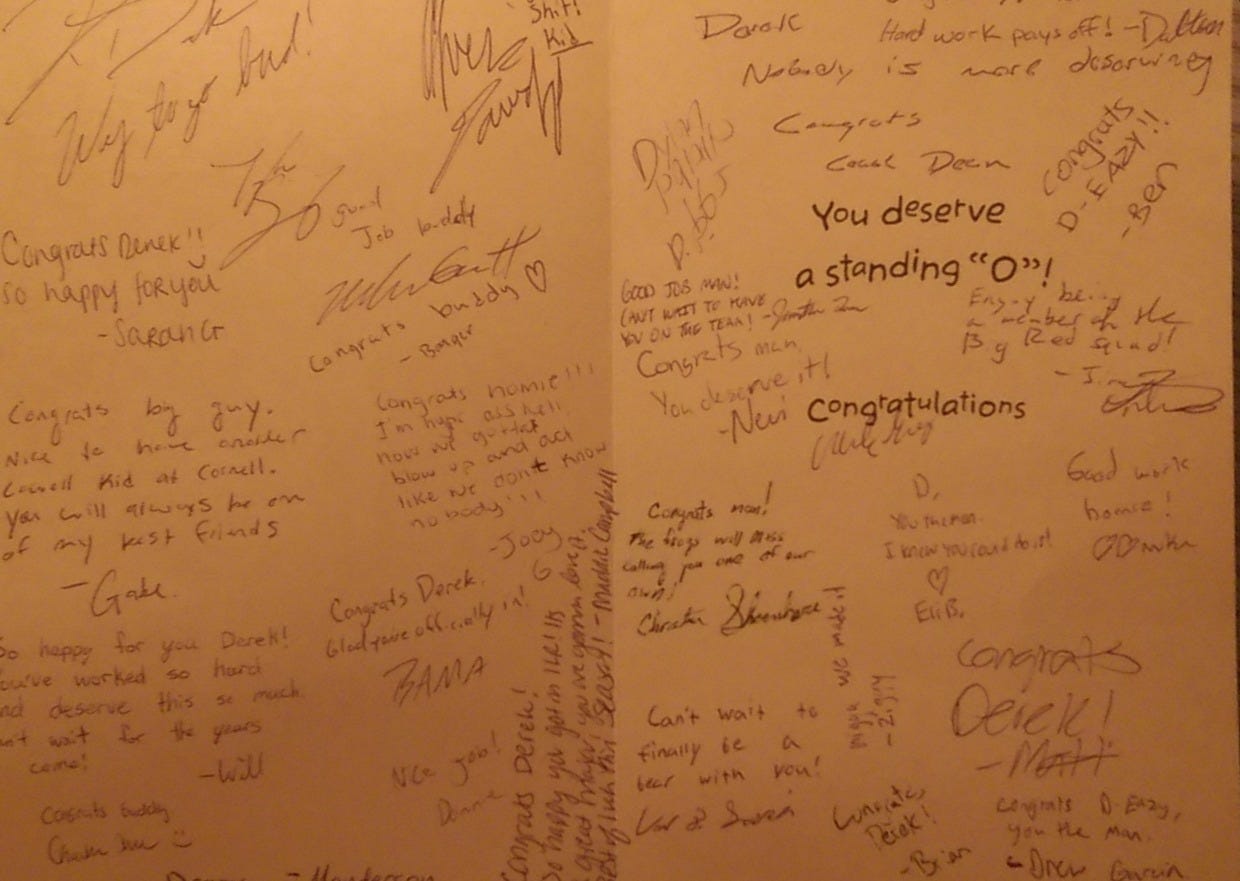 A card from all of my teammates after I got accepted—after the tournament I took some time and cried into the card in my room. I still have this card today.